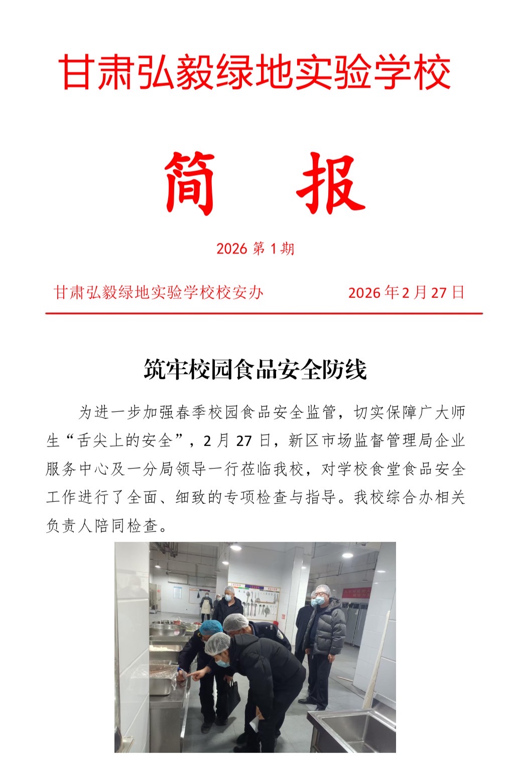 为进一步加强春季校园食品安全监管,切实保障广大师生“舌尖上的安全”,2 月 27 日,新区市场监督管理局企业服务中心及一分局领导一行莅临我校,对学校食堂食品安全工作进行了全面、细致的专项检查与指导。我校综合办相关负责人陪同检查。