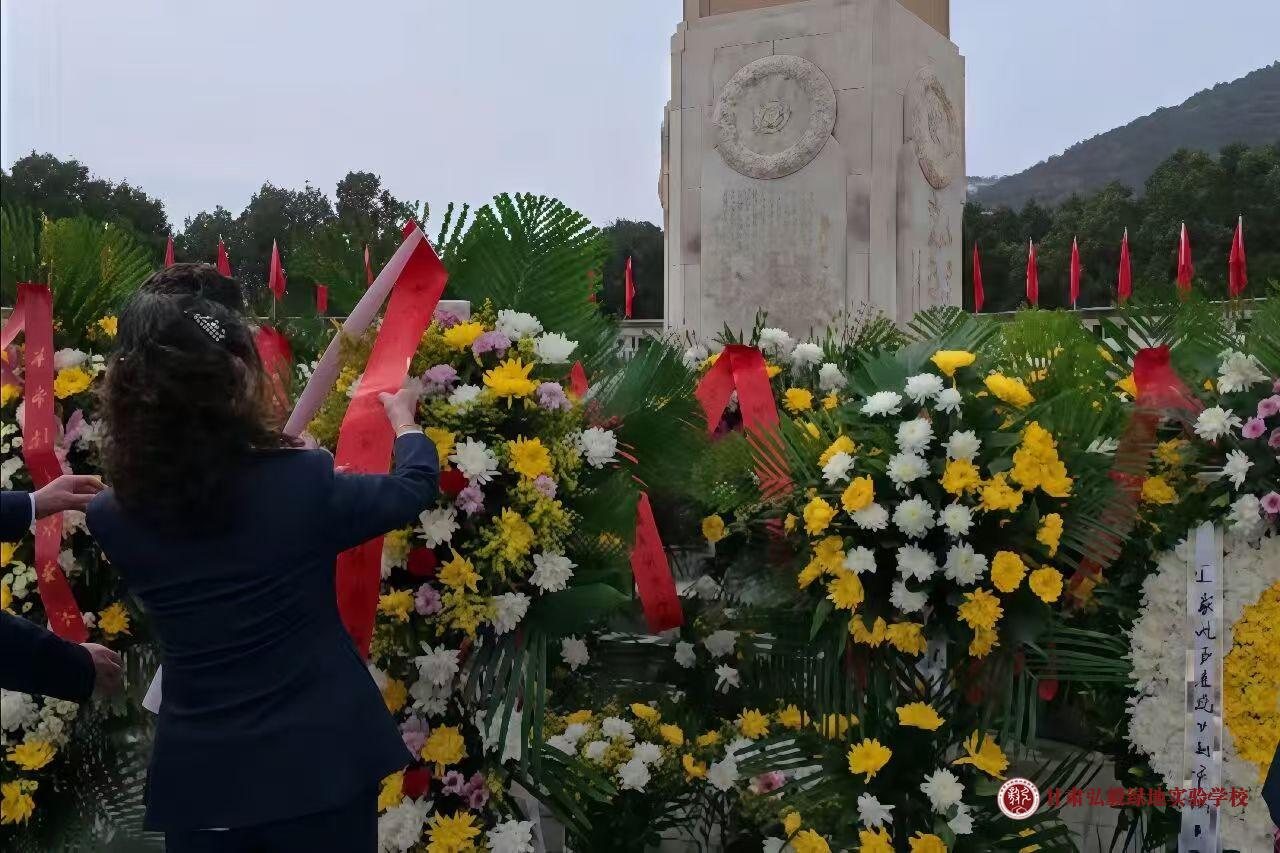 默哀结束后,校领导迈着坚定的步伐,向烈士纪念碑敬献花篮。鲜艳的缎带随风飘动,承载着全校师生对先烈的深切哀思与崇高敬意。